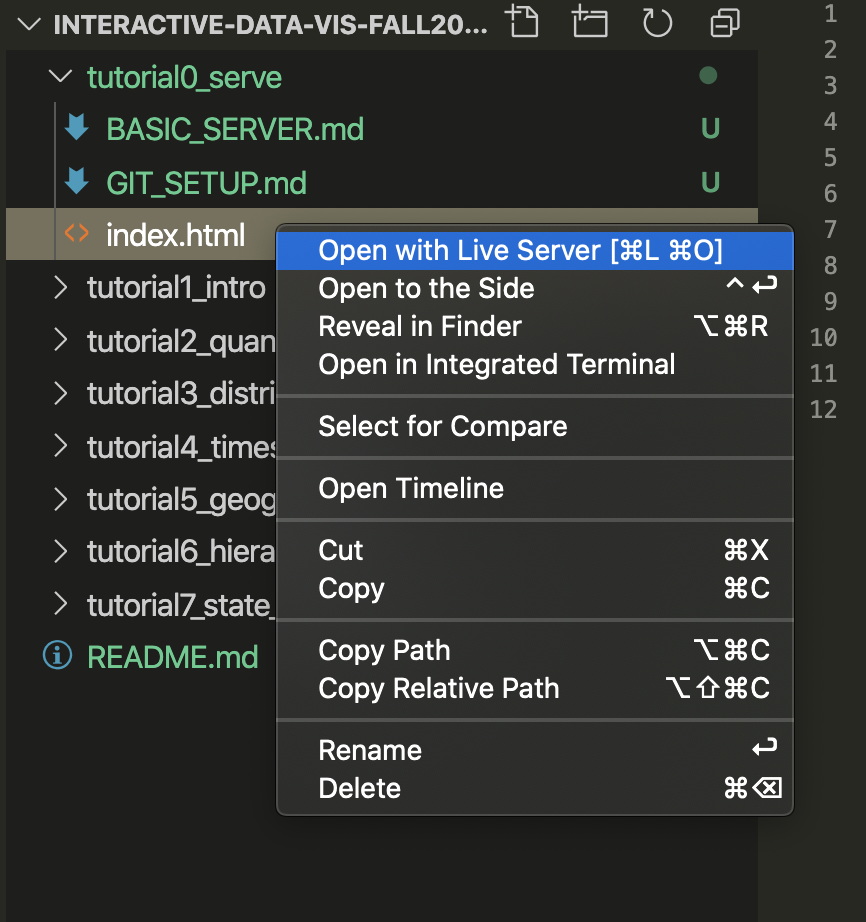 To start a new serve, right click on the HTML file you intend to serve. You will see a new menu item that says “Open with a Live Server”. Select this menu option.